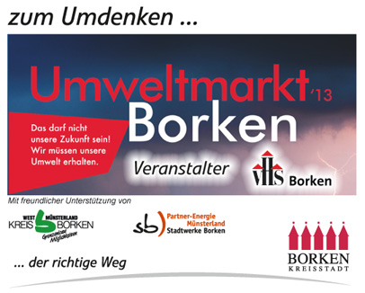 | 15. Juni 2013: 25. Borkener Umweltmarkt |  |  |  | Zahlreiche Attraktionen warten am Samstag, den 15. Juni, von 9 bis 14 Uhr auf ihre Besucher. Die Volkshochschule der Stadt Borken lädt in diesem Jahr zum 25. Umweltmarkt auf den Borkener Marktplatz ein. Bürgermeister Rolf Lührmann eröffnet um 9.30 Uhr den Markt, wobei er musikalisch von den Turmbläsern der Musikschule Borken begleitet wird. Die Besucher können sich auf einen bunten Querschnitt aus den Bereichen Ökologie, Umwelt und Natur freuen. Rund 30 Vereine, Organisationen, Bio-Bauern, Naturkosthändler und Firmen stellen sich vor. Damit hat der Borkener Umweltmarkt wieder eine Ausstellerdichte und Angebotspalette erreicht, wie sie in den letzten Jahren nicht gegeben war.
